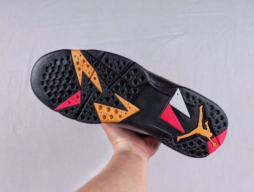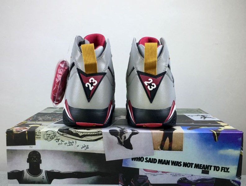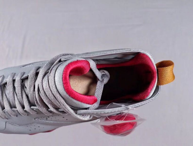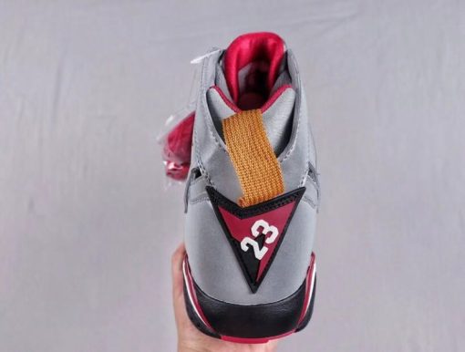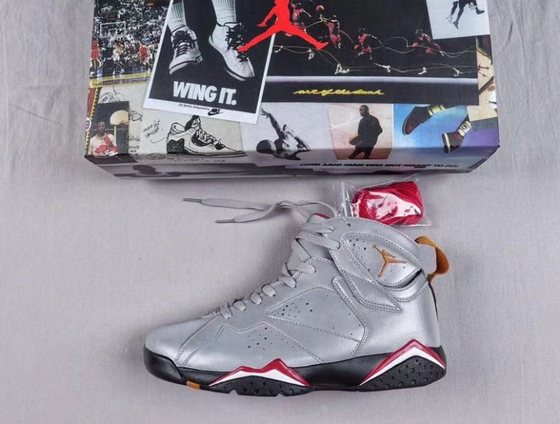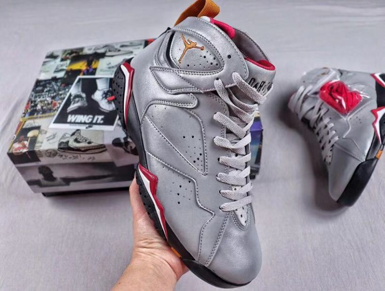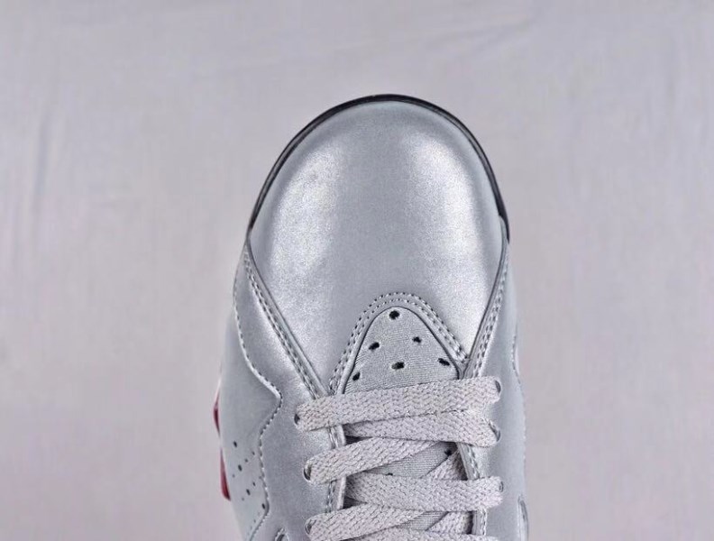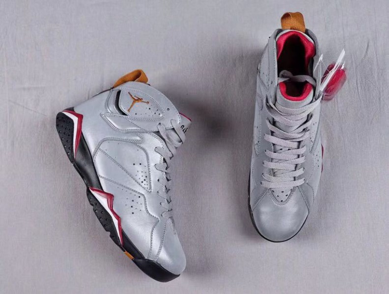 This Air Jordan 7 features a combination of reflective silver, red, black and bronze. The color scheme is similar to the original cardinal version, but the upper is made of reflective material instead of plain white.