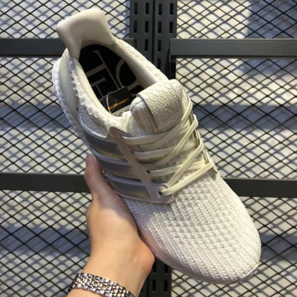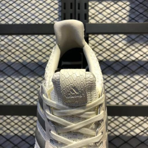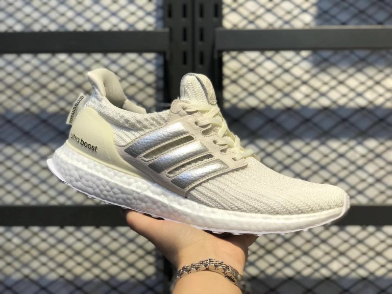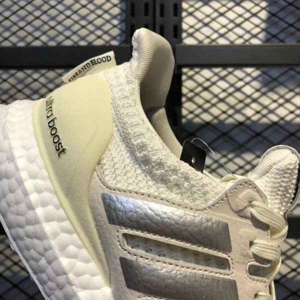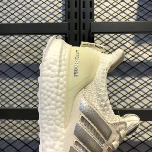 The adidas Ultra Boost House Targaryen upper is made of milky white Primeknit material, and the three stripes logo and heel also use the same tone. In addition, the three-stripes logo has silver on it, while the “Fire and Blood” font is written on the back. The Boost midsole comes in White, while the outsole comes in the same color.