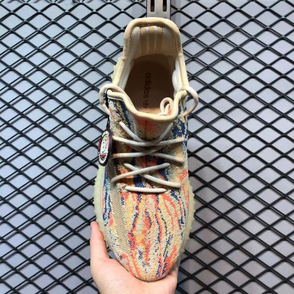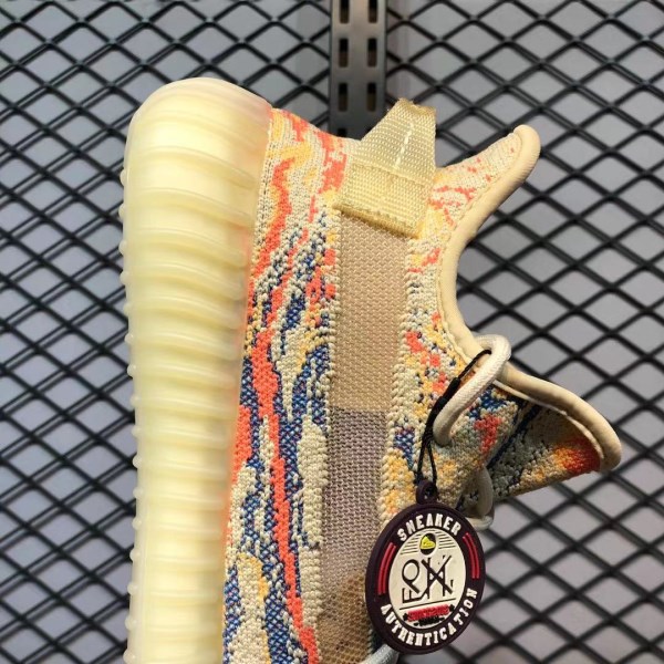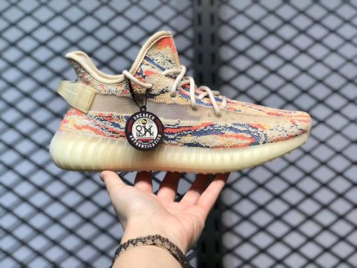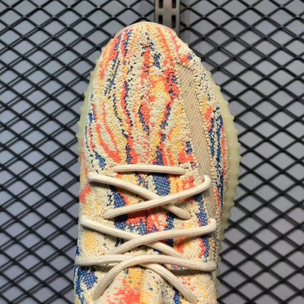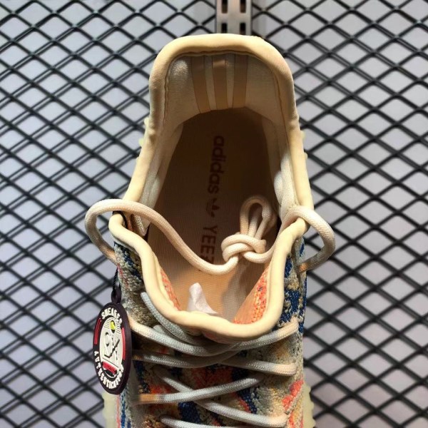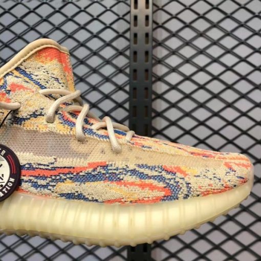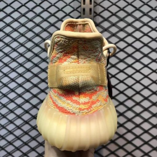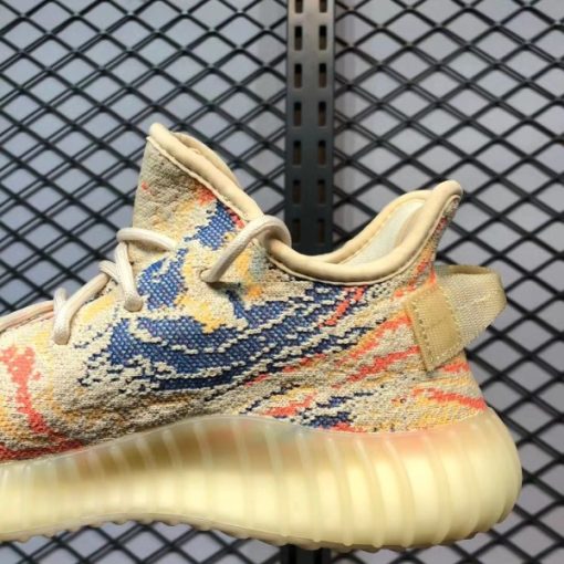 This adidas Yeezy Boost 350 V2 features a Yellow Primeknit upper with swirling patterns in Blue, Orange, and Gold tones. Translucent stripes run across the sides, and there’s a classic pull tab on the heel. Finally a translucent Boost sole completes the look.