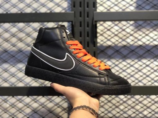 Nike Blazer Mid 77. This shoe adopts a design that has become popular in recent years. The pure black appearance is fashionable and versatile, and paired with bright orange shoelaces, it adds a touch of brightness to your outfit. The soles are made of wear-resistant material. Wearing it will make you feel comfortable in your daily life and work.