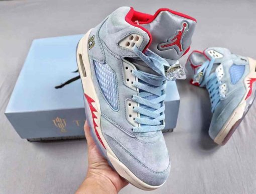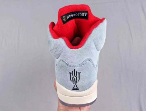 Trophy Room x Air Jordan 5 Retro is a limited edition shoe launched by Marcus Jordan. This “Ice Blue” version uses ice blue suede as the shoe body, and the midsole is decorated with red splashes. One of the shoes has the classic number 23 embroidered changed to the number 5, and the jump man logo on the heel has also been replaced with the Trophy Room logo. Many details highlight the special identity of this pair of shoes.