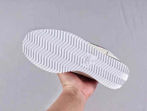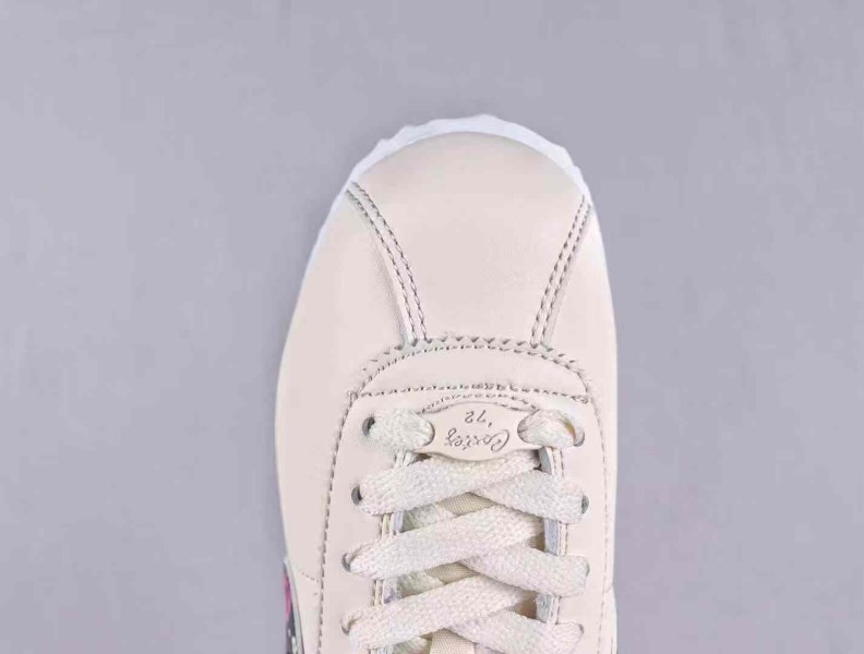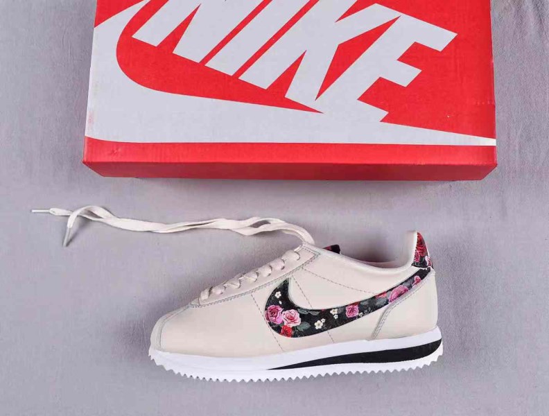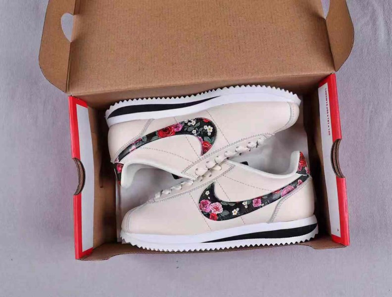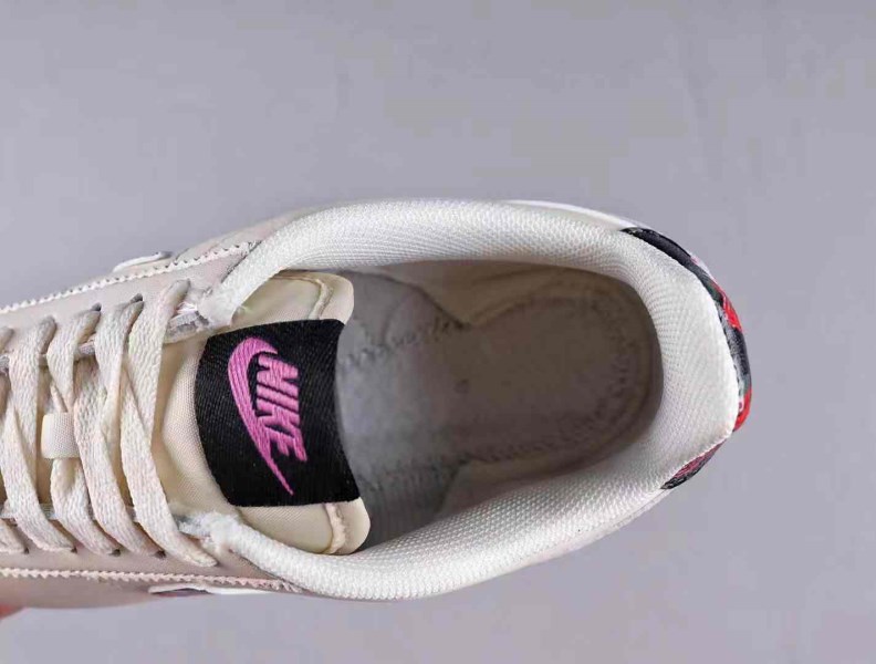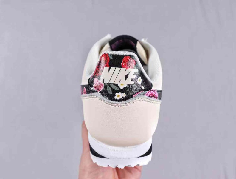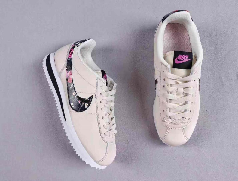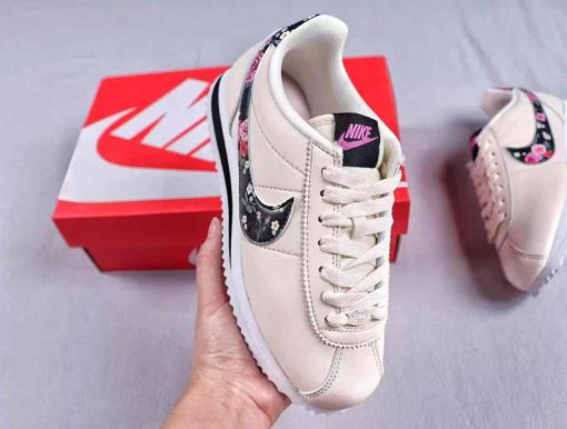 Designed closely to OG designs from the ’70s, this sneaker is sleek, streamlined, and chic. Features a classic Cortez look. Comprised of a cream synthetic upper that adds a retro feel to the silhouette, black Swoosh accents give it an even more retro feel, covering a red, pink and cream floral pattern that wraps around to the sneaker’s heel with Nike branding. Further branding on the tongue is embroidered in pink on a black background.