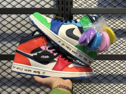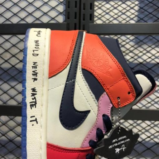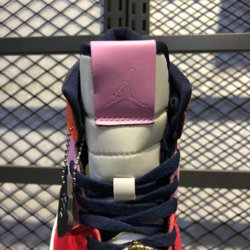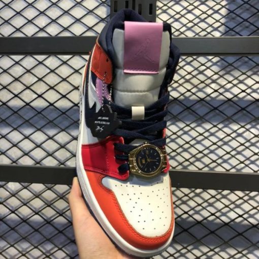 A mandarin duck color scheme jointly created with famous Los Angeles designer Melody Ehsani. This Air Jordan 1 comes dressed in a different and mismatched colorway theme. The left shoe will display blue and green colorways, while the right shoe comes in orange and pink. Both come dressed in Off-White on the base while Black is used on the midsole. Other highlights include text on the midsole, three sets of laces (including black, blue and purple), and the highlight is undoubtedly the eye-catching gold watch lace buckle.
