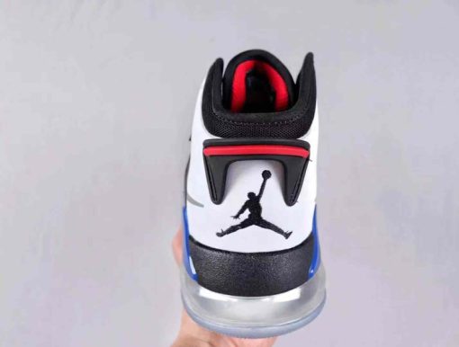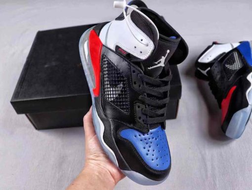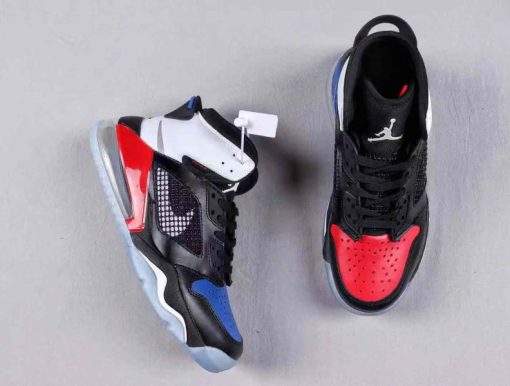 This Jordan Mars 270 “Top 3” sneaker comes dressed mostly in Black with Red and Blue used throughout; the two colors serve as an asymmetrical design. Jordan Mars 270 combines components from past Jordan shoes such as Air Jordan 1, Air Jordan 5, and Air Jordan 6, with silver swoosh and Air Jordan 6 pull-tab design on the heel, making it particularly convenient to put on and take off.