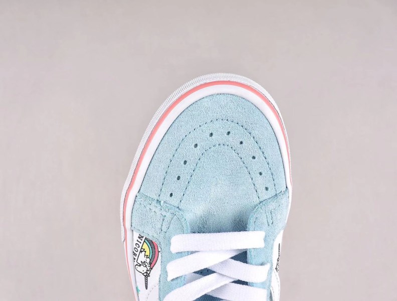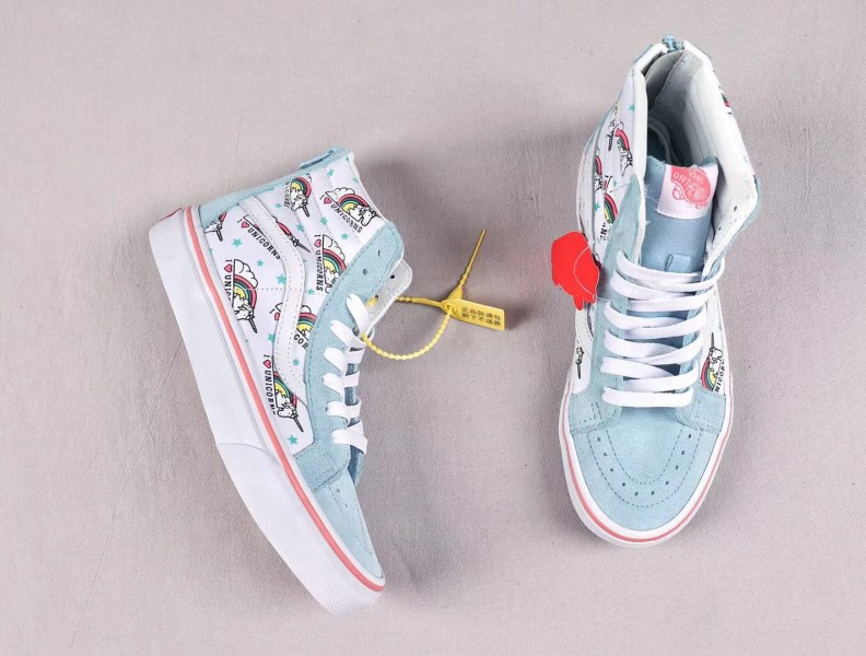 VANS has reinterpreted its classic SK8-Hi design and added the “I Love Unicorns” pattern on the mid-air canvas panel. Soft Cool Blue suede covers the toe box, tongue and heel, providing a nice contrast to the upper. The blue zipper heel is easy to put on and take off, and the pink vans logo on the white tongue makes the shoes look more exquisite.